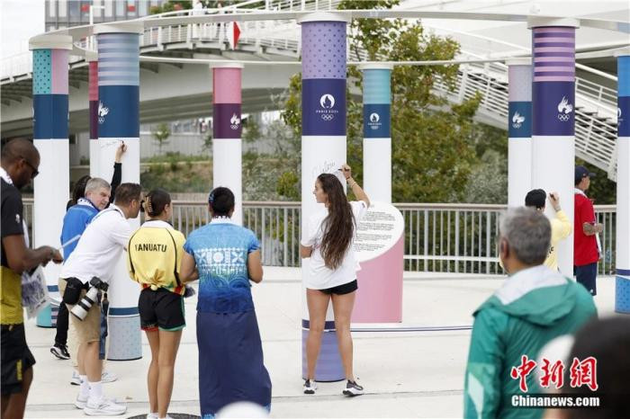 当地时间2024年7月22日,“奥林匹克休战墙”在巴黎奥运村揭幕,参赛的206个国家和地区奥委会及难民代表团的数百名运动员代表向世界发出呼吁——“给和平一个机会”。图为各国运动员在“奥林匹克休战墙”上签名。中新社记者 富田 摄